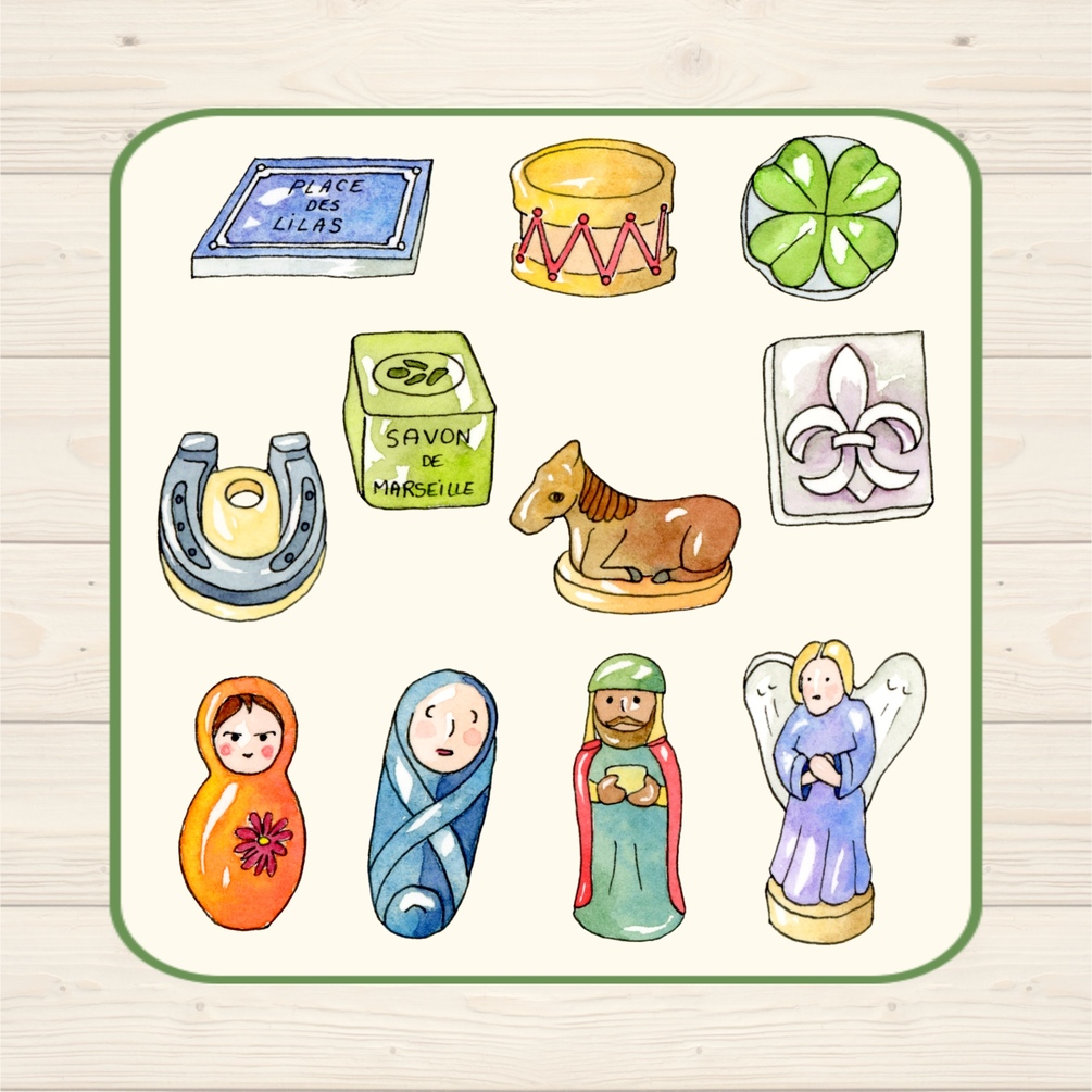 You will receive 22 individual png files with transparent backgrounds. Each charm is based on a French fève, a porcelain trinket that is traditionally placed in a Galette de Rois (King’s Cake) on January 6th in France.